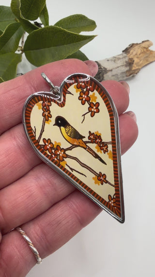 • A 2" long by 1-1 & 1/2" wide (including the stainless-steel jump ring) x 1/8" thick heart, hand resined, pendant.