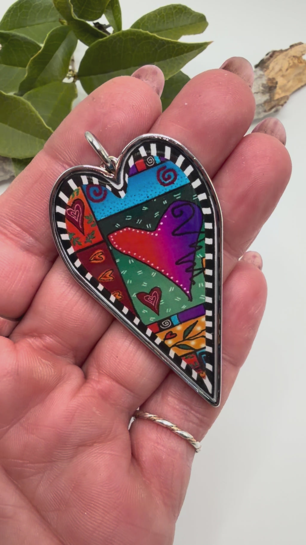 • A 2" long by 1-1 & 1/2" wide (including the stainless-steel jump ring) x 1/8" thick heart, hand resined, pendant.
